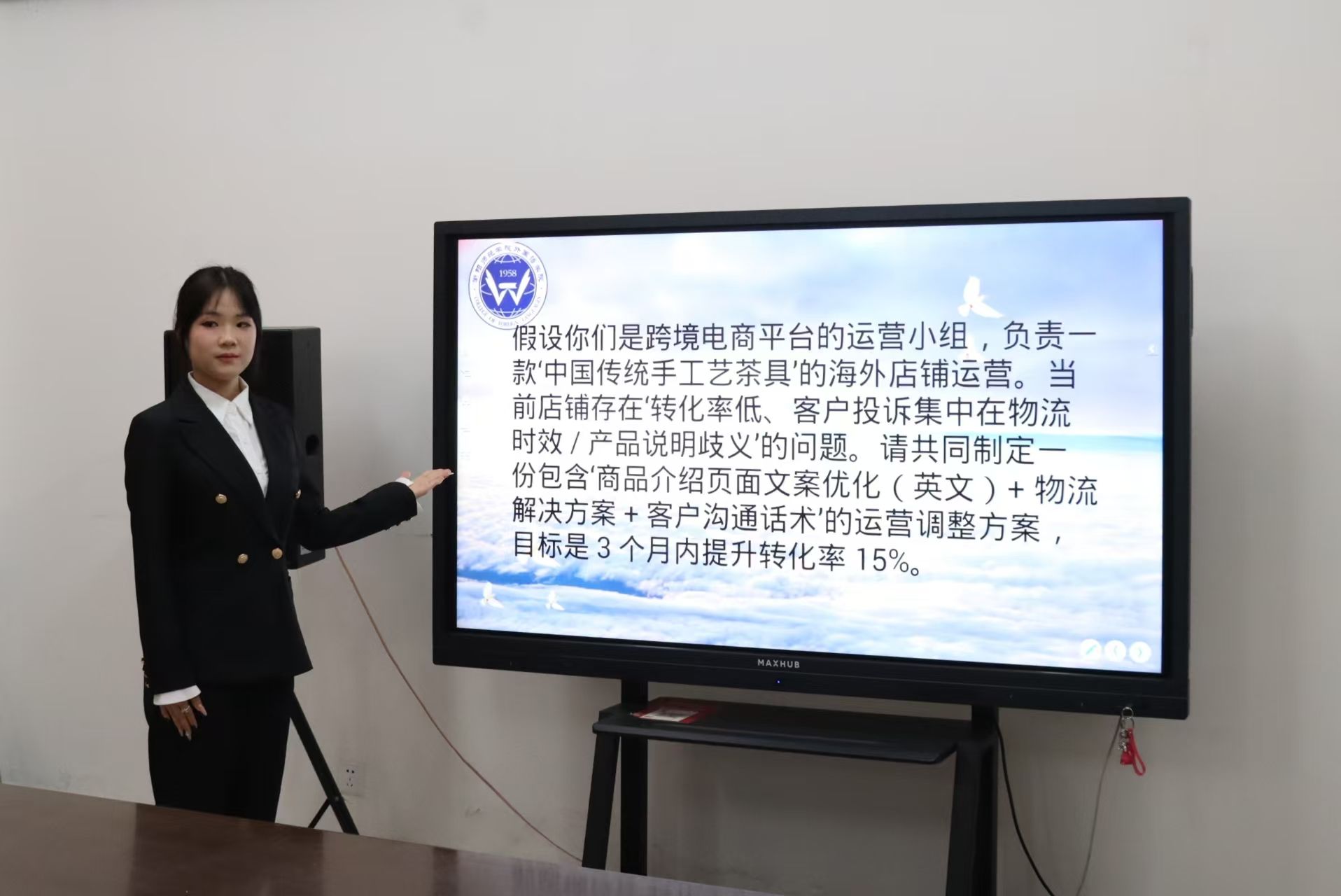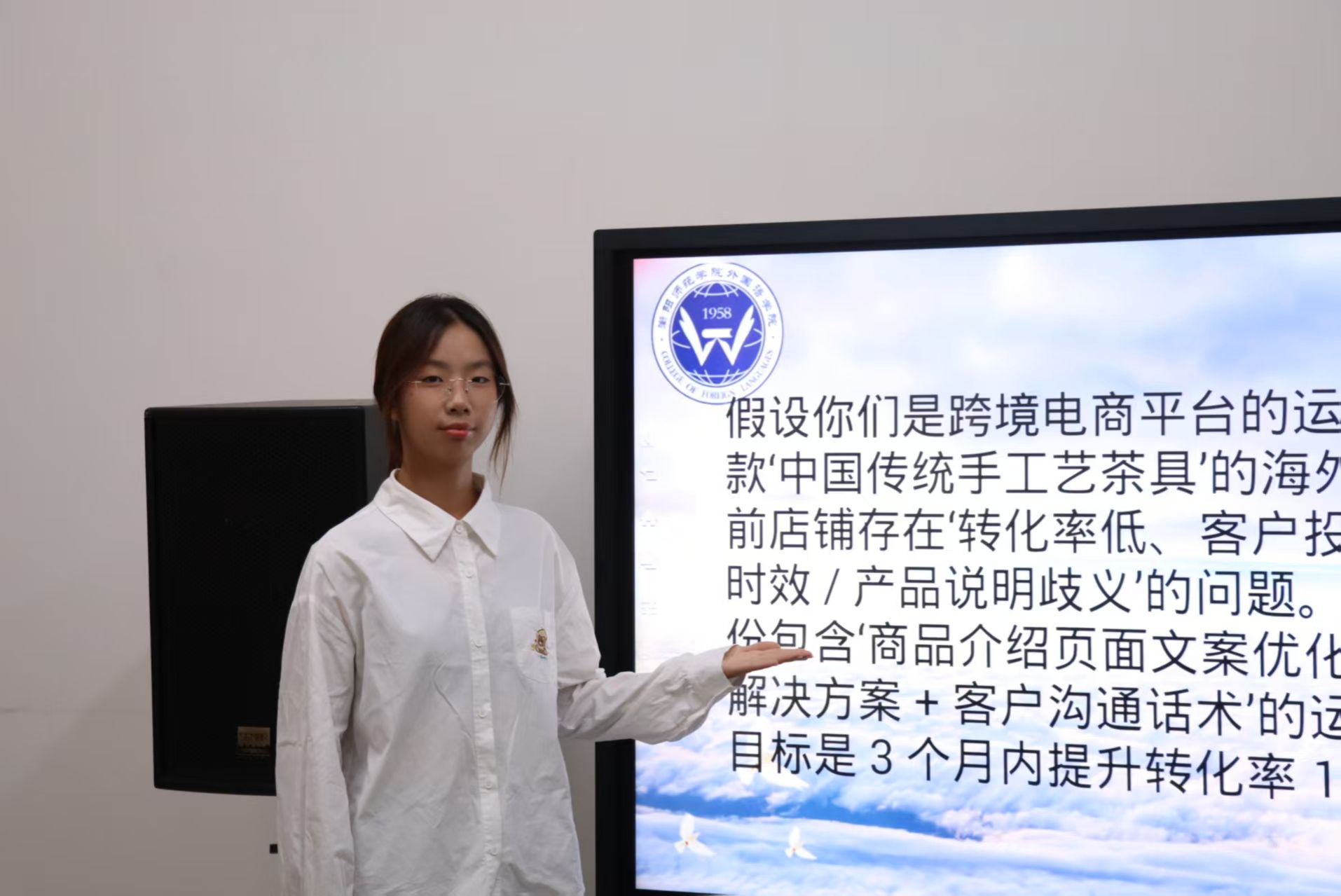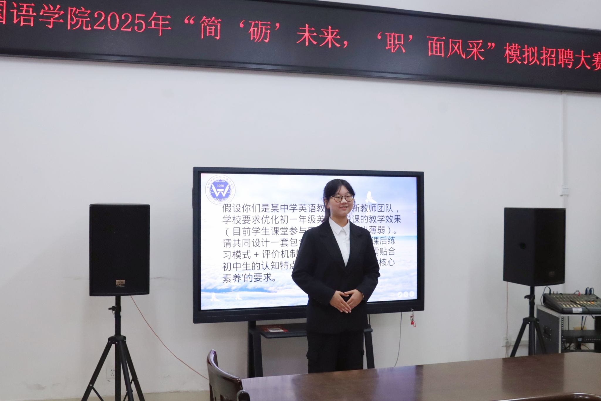 决赛现场,英语师范专业采用“简历答辩+模拟教学展示”双环节比拼模式。学子们现场演示英语语法趣味教学、跨文化主题课堂设计,将简历上的文字转化为生动鲜活的教学实践,彰显了出色的师范专业课堂把控能力。商务英语的晋级选手通过技能展示、多对一面试两个核心环节,全面呈现专业素养与职业规划,并在之后的技能展示环节,展现了商务英语专业特有的问题解决能力,充分展现了对商务行业的深入认知。翻译专业高度还原企业招聘场景,采用“多对一面试+技能展示”的企业化招聘模式。面对提问时,选手们从容应答、充分展示专业能力。