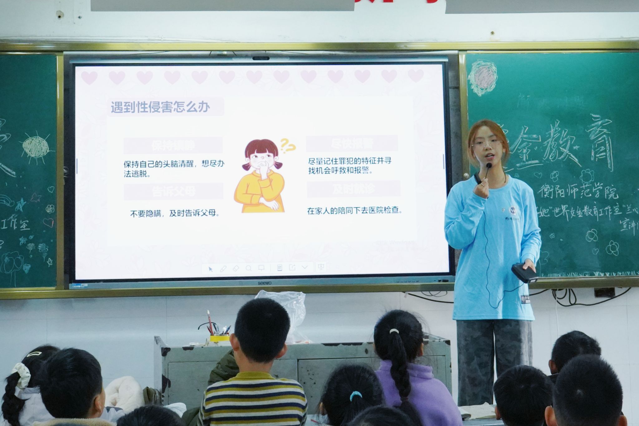 后半段课堂里,宣讲团结合专业特色,将英语操融入安全教育:“Baby有个小肚肚,上上下下要保护……”欢快的节奏配上活泼的肢体动作,安全知识变成了朗朗上口的歌谣。孩子们跟着律动摆动手脚、大声跟读,防性侵的意识也跟着旋律在心里慢慢扎根。到了随堂问答环节,孩子们逻辑清晰地抢答,每一个认真的回答都能换来一颗甜糖果,这份小甜蜜,让安全意识的种子在心里扎得更牢。
