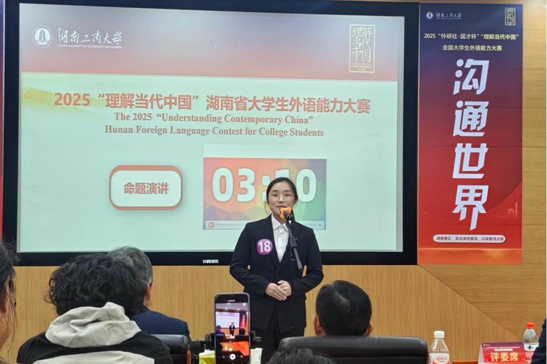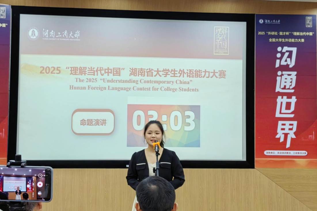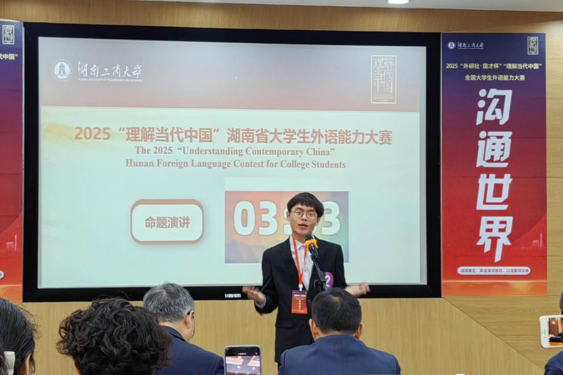 群雄逐鹿展风采,以赛育人谱新篇。2025 年10月24日至26日,由湖南省教育厅主办、湖南工商大学承办的“2025 年外研社・国才杯‘理解当代中国’湖南省大学生英语能力大赛” 成功举办。本次大赛以习近平新时代中国特色社会主义思想为指引,深入贯彻党的二十大精神,紧扣立德树人根本任务,着力推进“三进”工作走深走实,为高校外语教学改革提供实践支撑,为学子搭建语言实践与跨文化交流的优质平台,助力培养兼具家国情怀与国际视野的实战型外语人才。