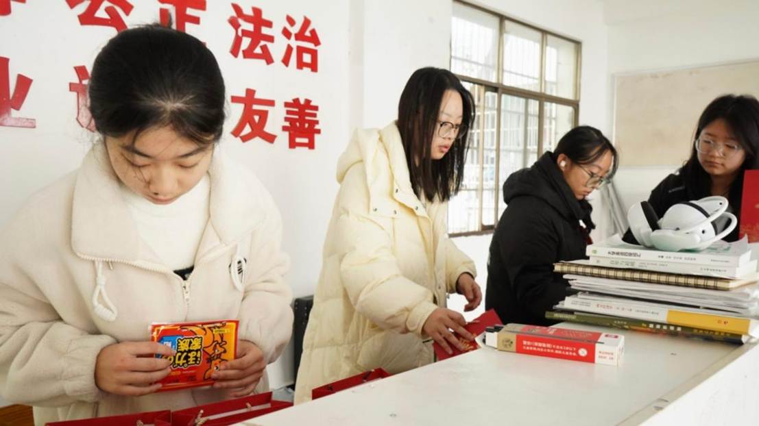 同时,学院还为每一位考研学子精心准备了“考研冲刺加油包”,祝愿考研学子能够一战成硕,金榜题名。学弟学妹们为物资贴上暖心的标签,细心地将其装袋:寓意“考研成功”的橙子,是对上岸的直接美好期许;旺仔牛奶的加持,考试运势必定旺!暖宝宝的暖心陪伴,消除了考试的孤独与疲惫,带来了慰藉和底气。这些细微的细节中,包含着大家对考研学长学姐的深情祝福和殷切期待。2022级辅导员刘志伟亲手为考研学子写上贺卡,平淡的言语中,饱含着老师对学生的最真切的关怀与期许,寄托着对未来前程的美好祝愿。