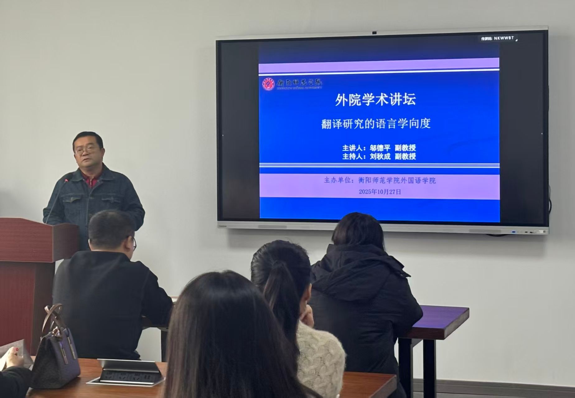 2025年10月27日(星期一)下午3点,邬德平博士在东校区外语楼北504为我院师生做了一场题为“翻译研究的语言学向度”学术讲座,由刘秋成副教授主持。这是本学期我院第三次学术讲座,30余名师生积极参与了上述活动。