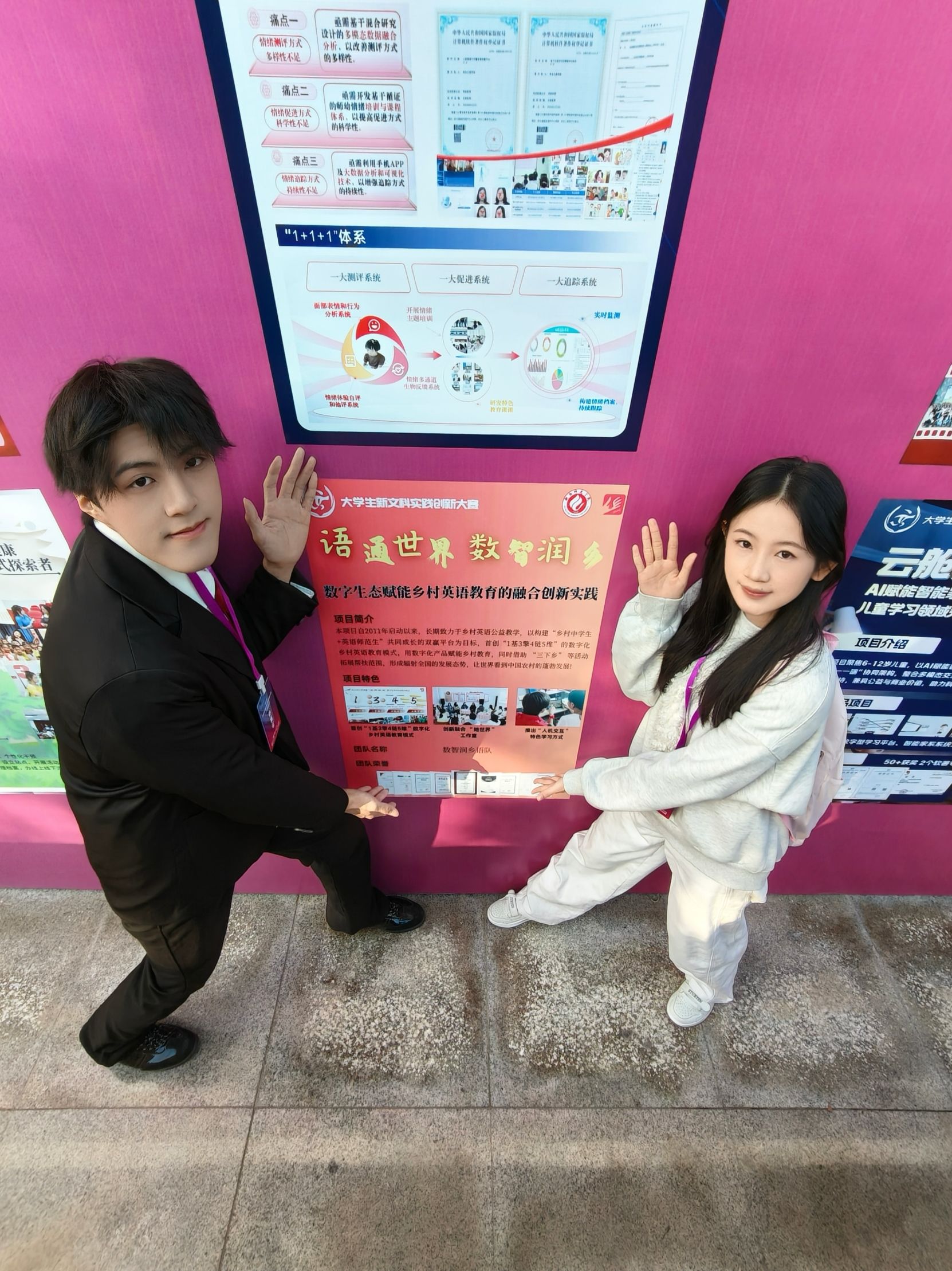 该获奖项目由唐玮同学领衔,林叶晟、林琳、赵国淋、周逸菲、李请、李子威、张婷婷、许谨、凡淑敏、刘强等十位成员组成的团队,怀揣对乡村教育的赤诚热忱携手攻坚。备赛阶段,团队精准锚定乡村英语教育的核心痛点,在何文娟、贺学耘两位教授的全程悉心指导下,深耕项目逻辑架构,反复校准实践实施方案,对展示内容进行多轮打磨优化。晋级现场赛后,团队成员进一步凝心聚力,逐字雕琢路演脚本,细致打磨答辩环节的每一处细节,以日夜坚守的实干姿态诠释当代青年学子的责任与担当。值得一提的是,团队精心设计的项目宣传海报获大赛主办方高度认可,在决赛现场展示区重点亮相,充分展现了我校学子的创新素养与专业风采。