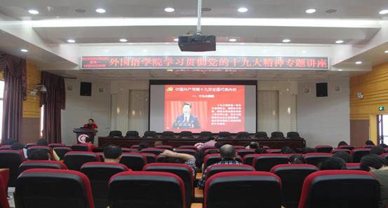 4月23日下午,我院在外语楼北311多媒体厅开展学习贯彻党的十九大精神专题讲座,我院全体教职员工聆听本次讲座。讲座由外国语学院院长贺学耘主讲。贺院长首先回顾了党的十九大主题:不忘初心,牢记使命,高举中国特色社会主义伟大旗帜,决胜全面建成小康社会,夺取新时代中国特色社会主义伟大胜利,为实现中华民族伟大复兴的中国梦不懈奋斗。以及党的十九大议程、党的十九大召开的重要意义。
