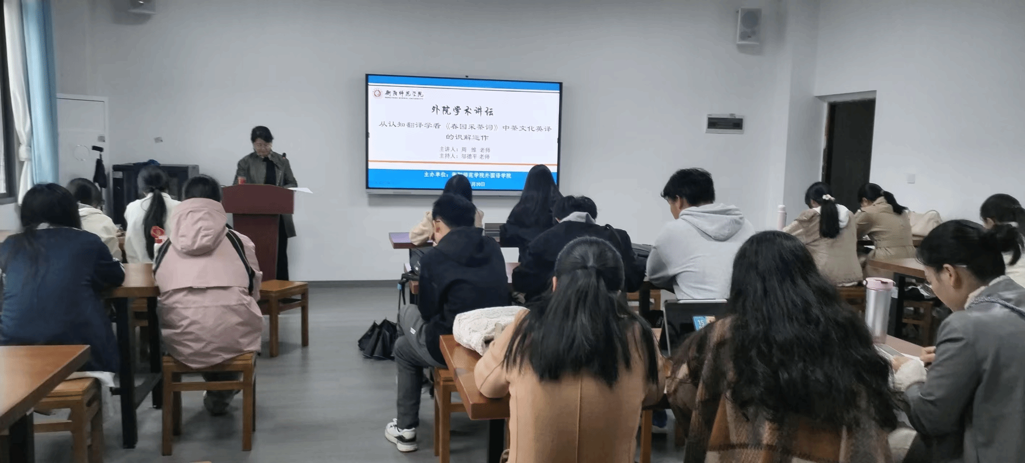 2025111015:00,外国语学院于外语楼北504举办学术专题讲座。本次讲座以从认知翻译学看《春园采茶词》中茶文化英译的识解运作为主题,由周维老师主讲、邬德平老师主持,是本学期我院第四场学术活动。部分教师、研究生及本科生齐聚现场,共同探讨茶文化与翻译学的跨域融合之道。